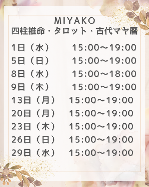 サロンスケジュールは上記となります。全9日間で8日のみ15時~18時、あとは15時~19時で入ります。